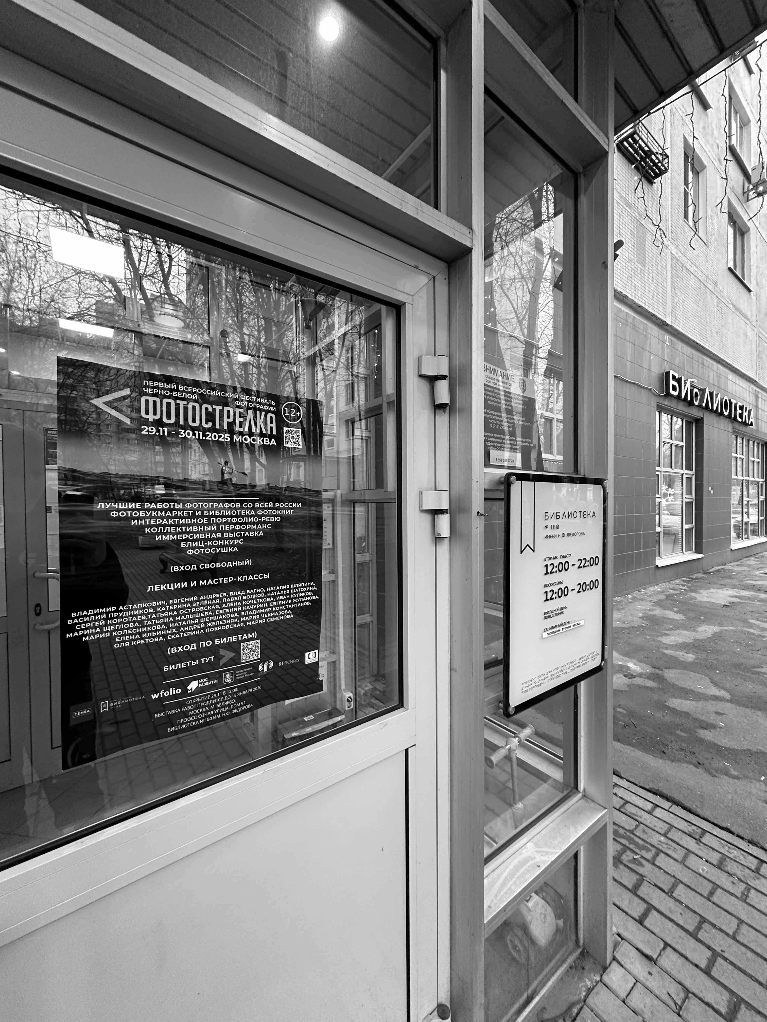 29–30 ноября 2025 года в Московской в Библиотеке №180 имени Н. Ф. Фёдорова прошёл оВсероссийский фестиваль чёрно-белой фотографии «Фотострелка».