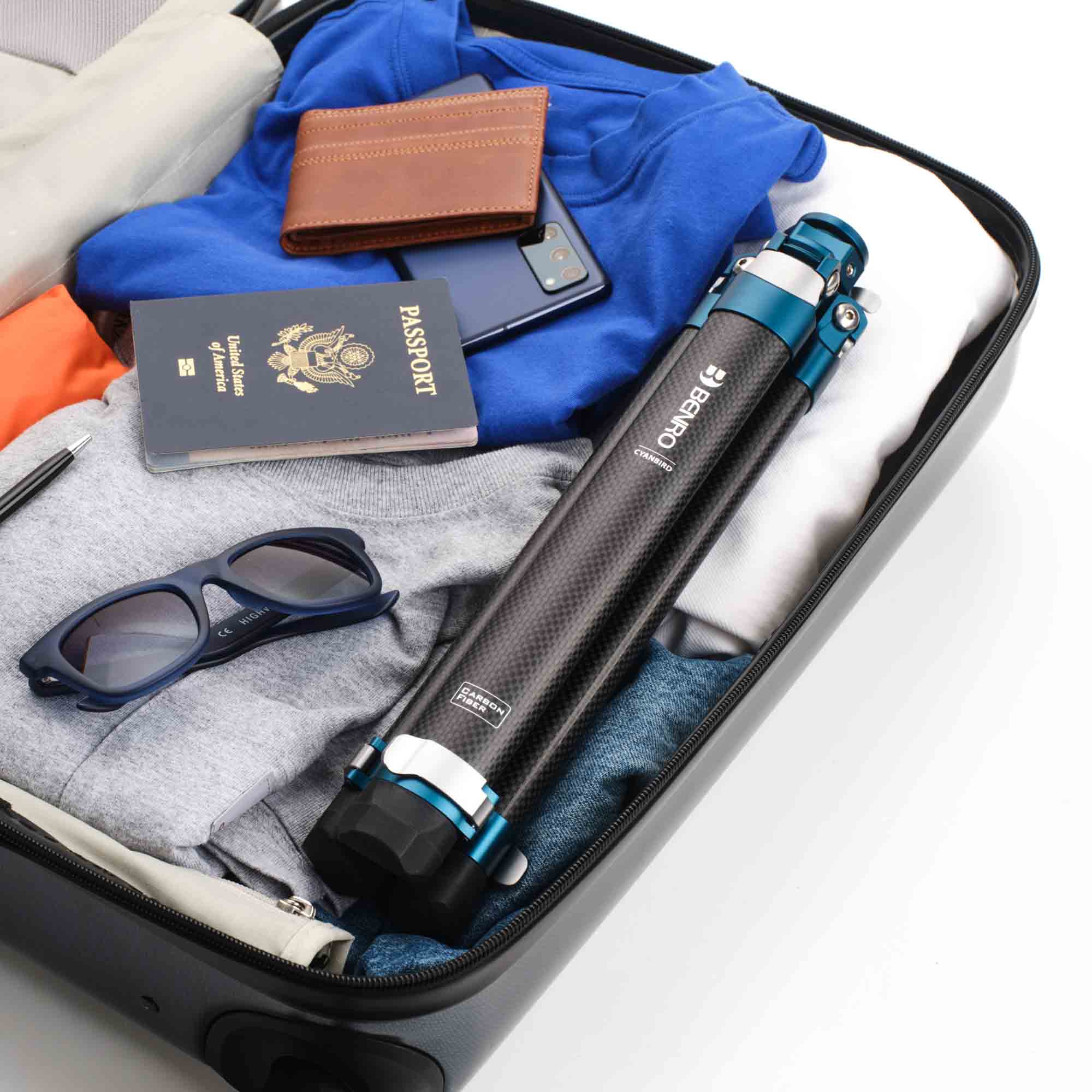 Секции штатива в сечении имеют эллипсовидную форму. За счет этого в сложенном виде штатив чрезвычайно тонкий - 5,7 см в диаметре. Перемещаясь от одной локации к другой, не обязательно убирать штатив в чехол, в объеме он не больше банки с напитком и удобен для переноски в руке.