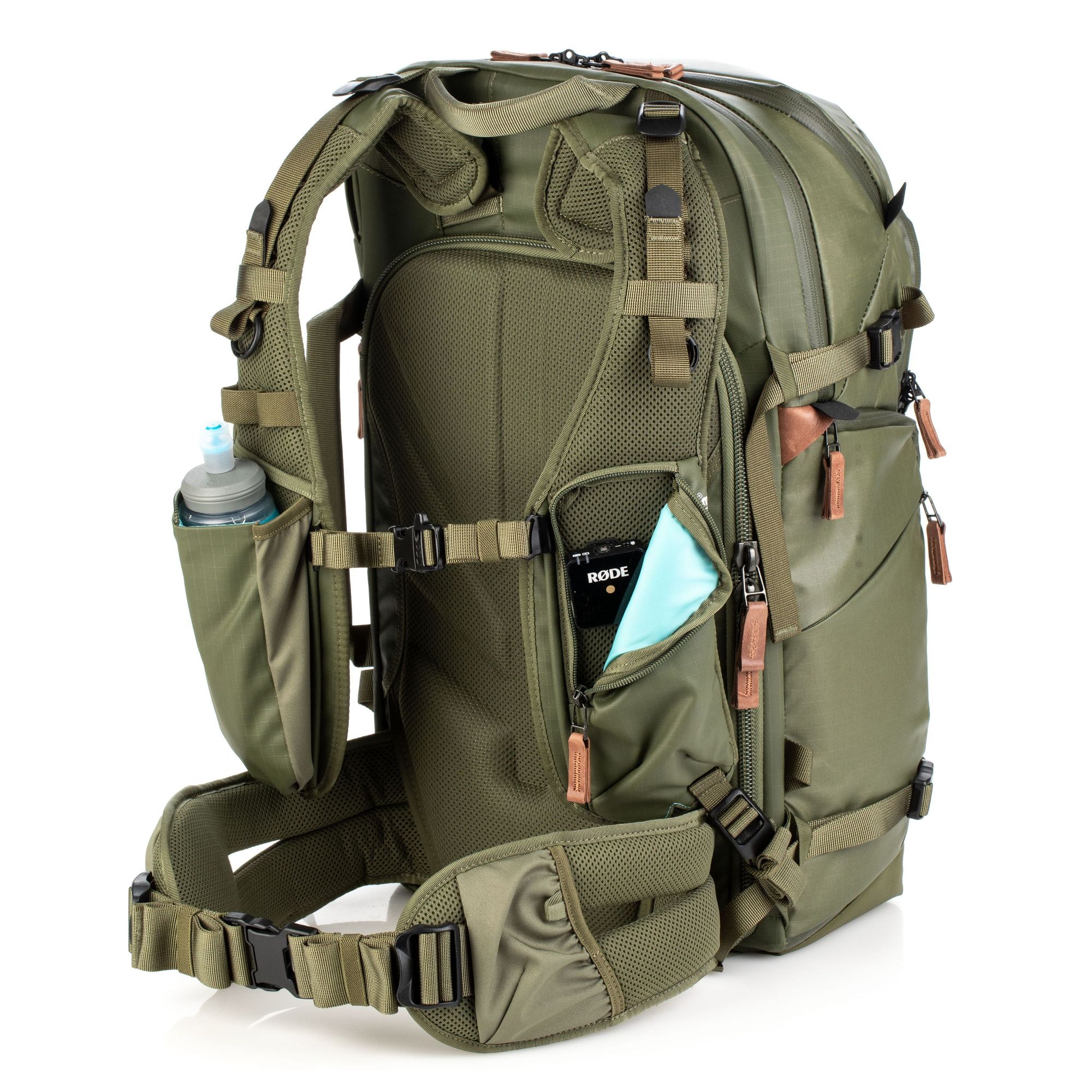 На наружной части боковых карманов расположены молнии, скрывающие сетчатые карманы с затяжкой для бутылки с водой и штатива. При необходимости их можно достать и использовать с наружной части рюкзака.