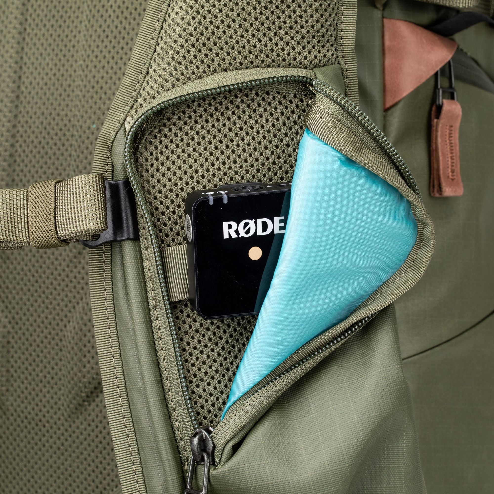 На плечевых ремнях два кармана на молнии. Один расширяемый для бутылки с водой. Второй для смартфона и внутренней стропой для петличного микрофона.