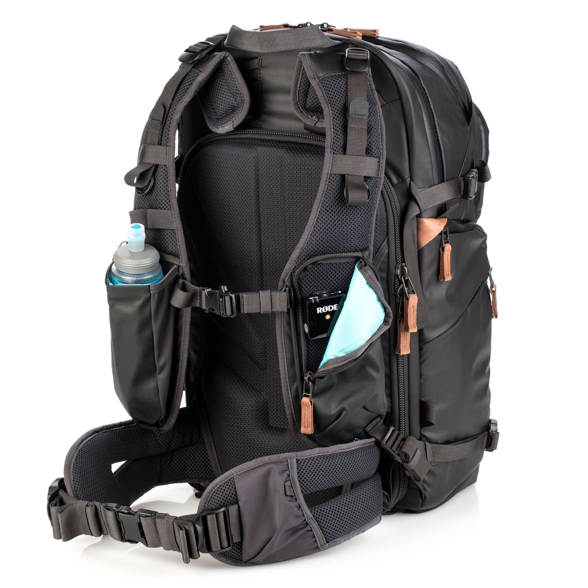 На наружной части боковых карманов расположены молнии, скрывающие сетчатые карманы с затяжкой для бутылки с водой и штатива. При необходимости их можно достать и использовать с наружной части рюкзака.