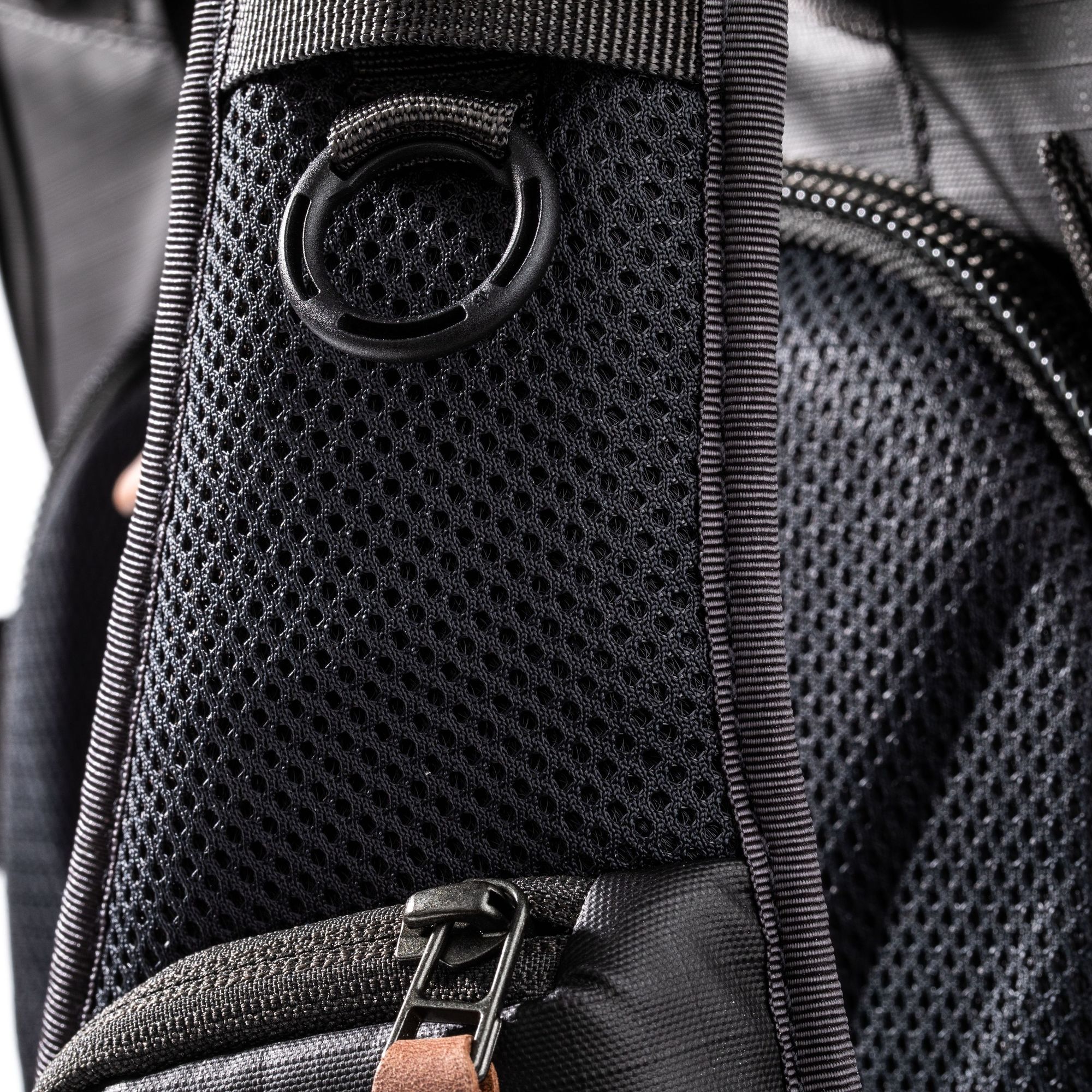 Нижняя часть рюкзака изготовлена из термопластичного полиуретана, более устойчивого к воде и истиранию. Там же распложены два вентиляционных отверстия, чтобы ограничить возможное скопление конденсата внутри рюкзака.