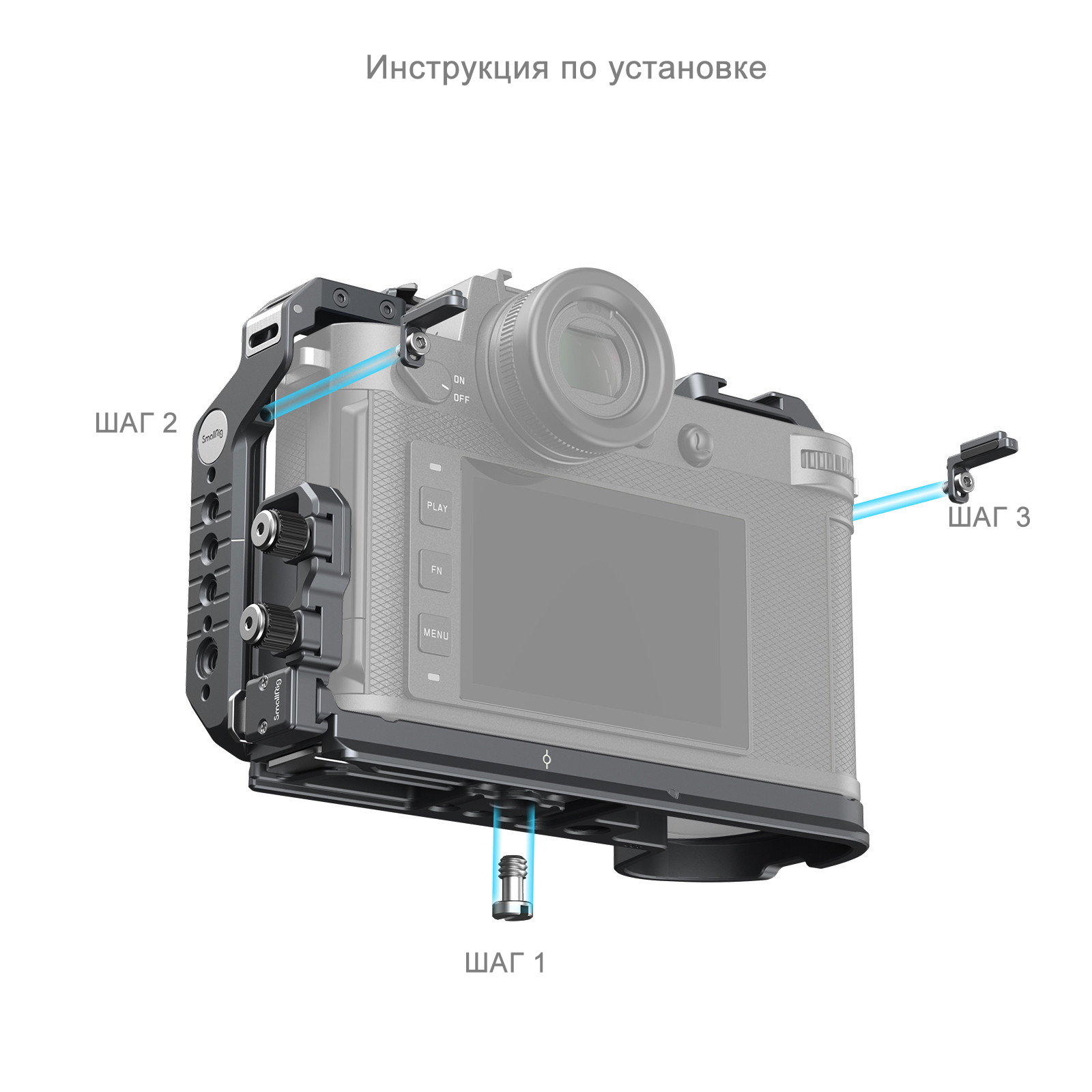 Клетка имеет проушины для установки кистевого и плечевого ремня (SmallRig 3848, PSC2428), а также совместима с быстросъемным креплением QD для фиксации плечевого ремня SmallRig 4118. Нижняя площадка клетки совместима с креплением Arca-Swiss, это дает возможность быстро установить камеру на штативы и электронные стабилизаторы DJI RS 2 / RSC 2 / RS 3 / RS 3 Pro. Фиксатор кабеля разблокируется одним нажатием, для быстрого и удобного монтажа оборудования.