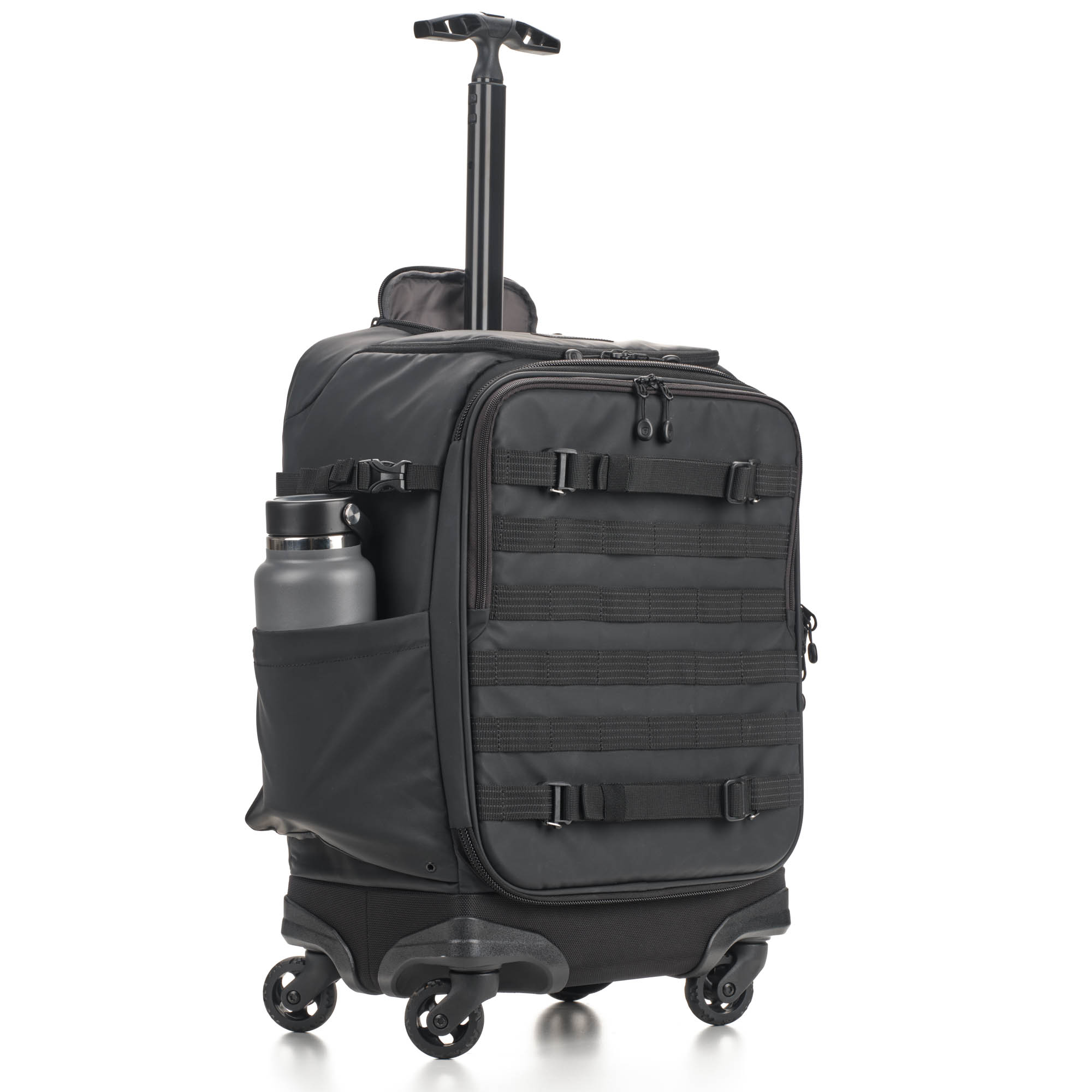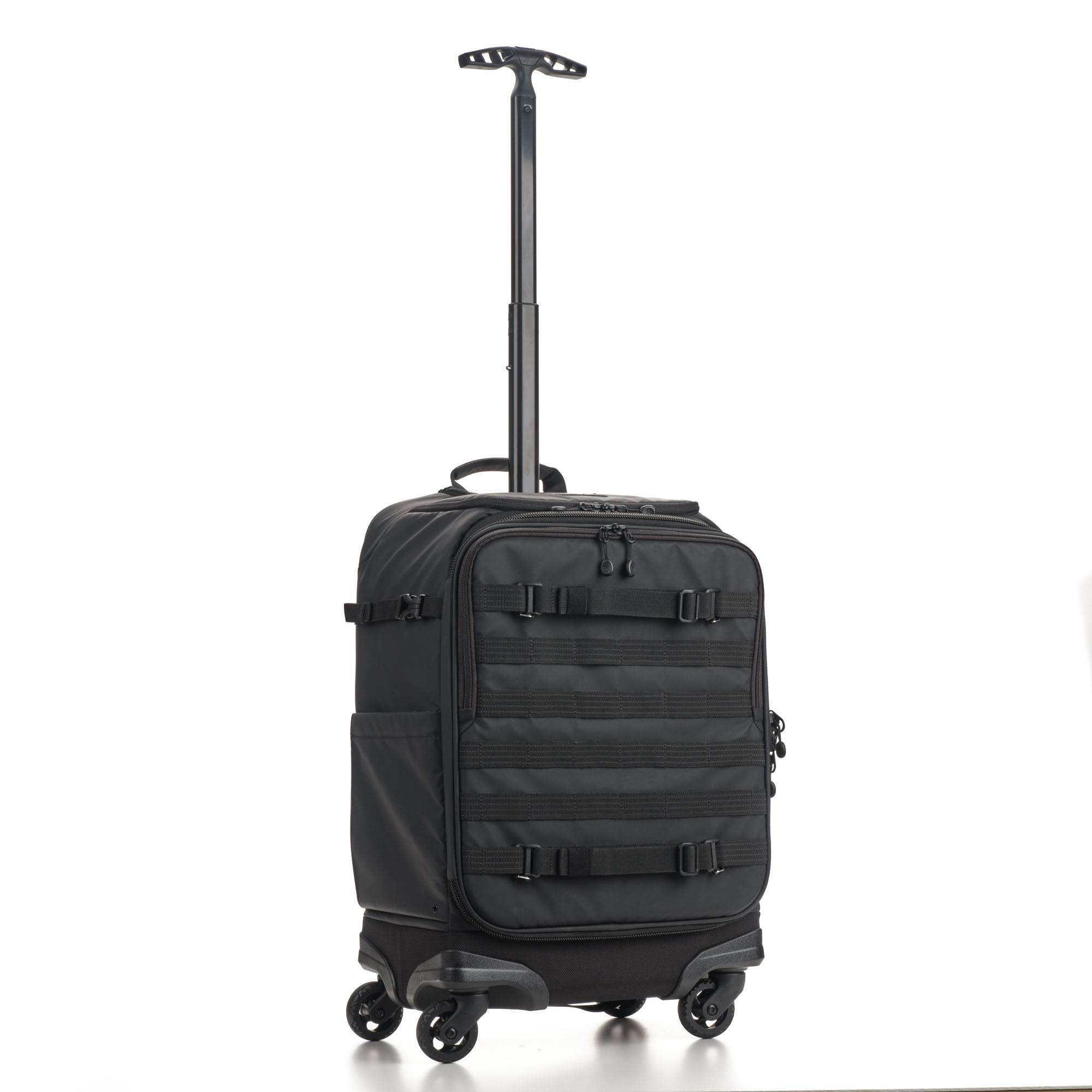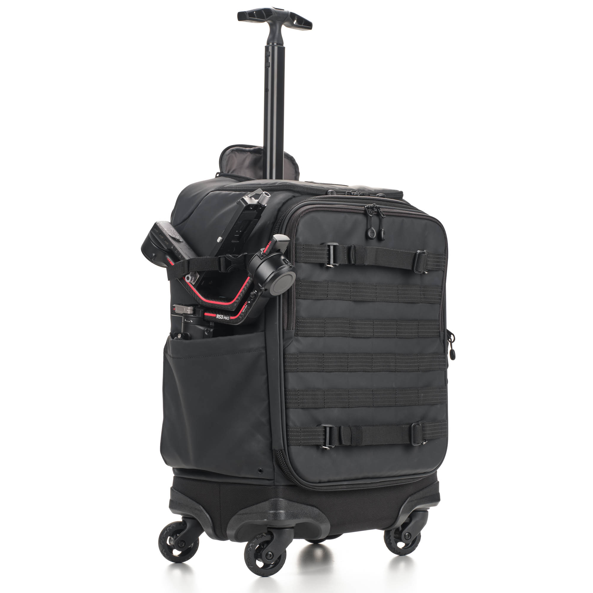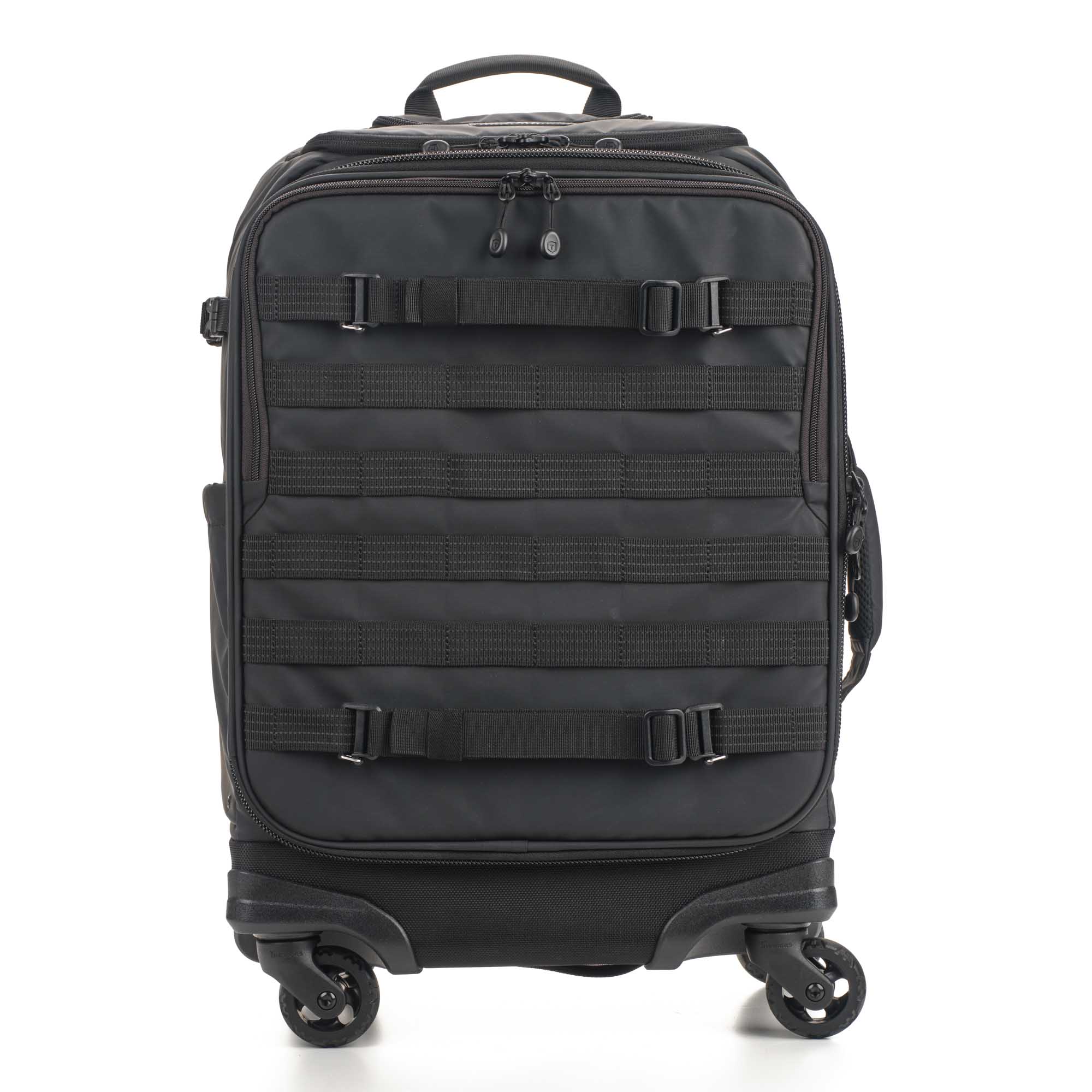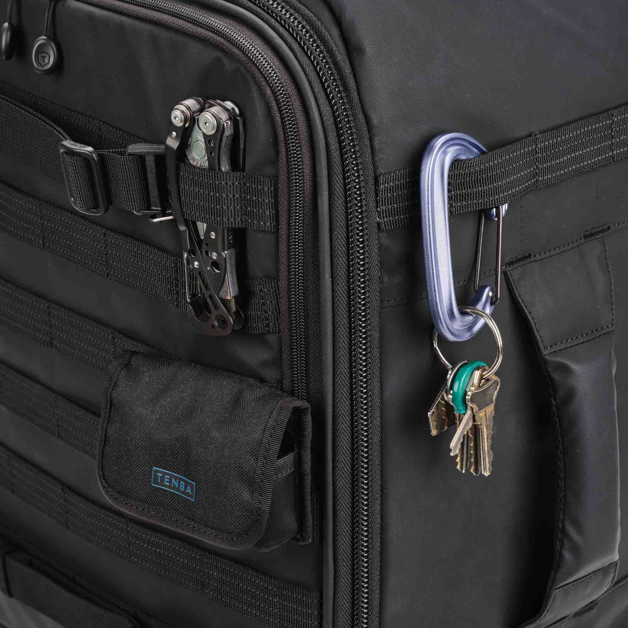 Не ограничивайте себя внутренним объемом чемодана. На передней и боковой панелях расположены стропы MOLLE, на которых можно разместить внешний обвес – чехлы для аккумуляторов и карт памяти, мультитул, карабин.