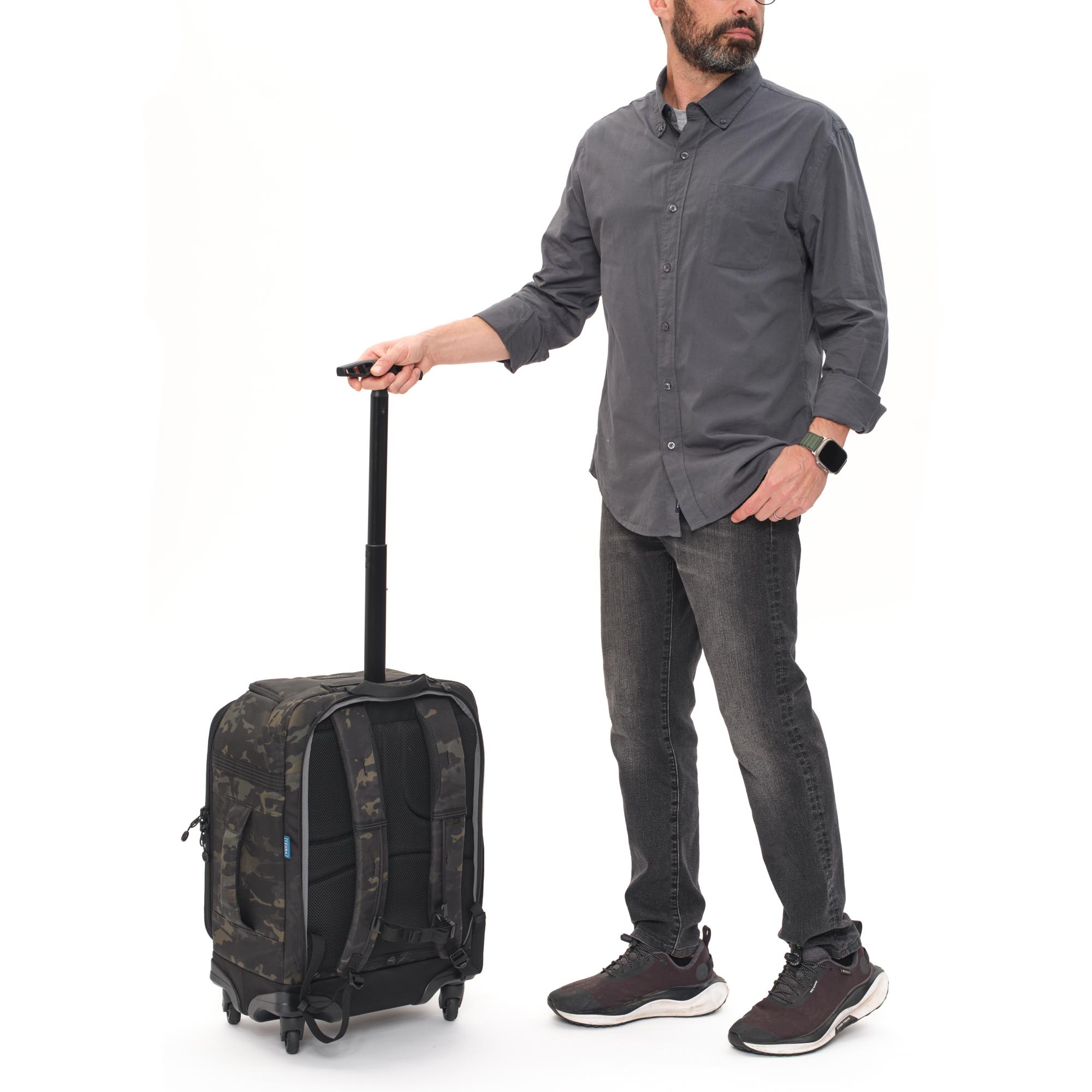 Для переноски чемодана по лестнице, неровной дороге или грунту, где нет возможности катить чемодан, предусмотрена трансформация в рюкзак. На задней стенке в кармане на молнии расположены удобные плечевые лямки для переноски чемодана в формфакторе рюкзака.