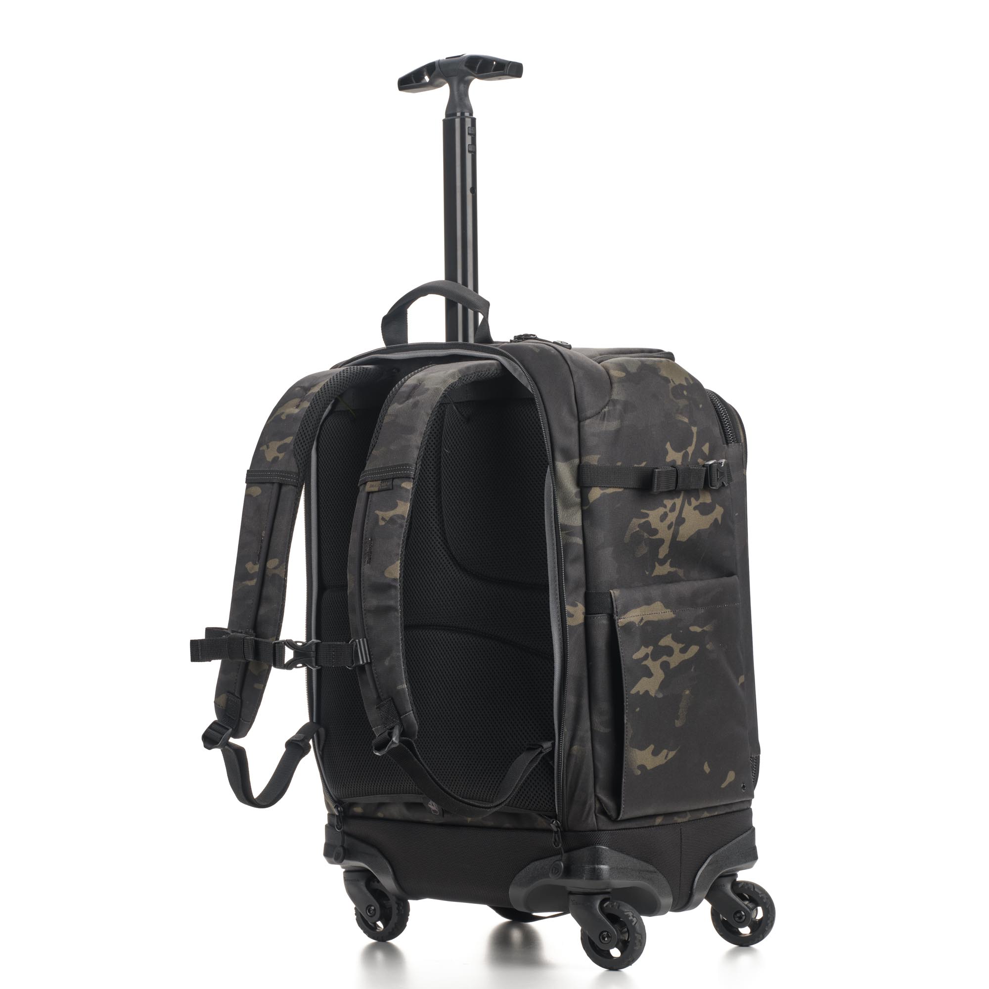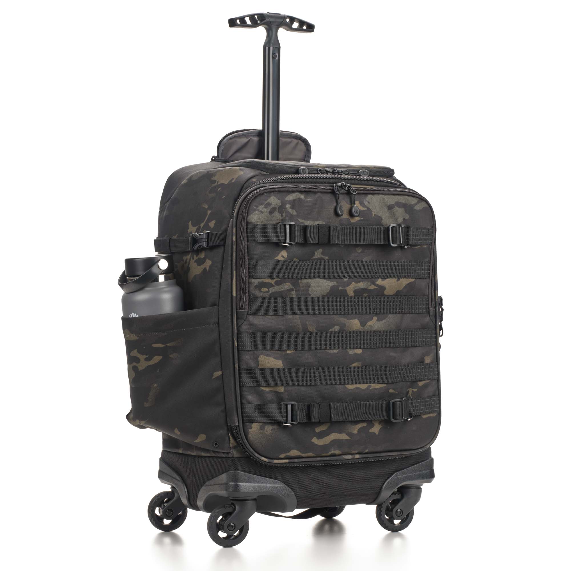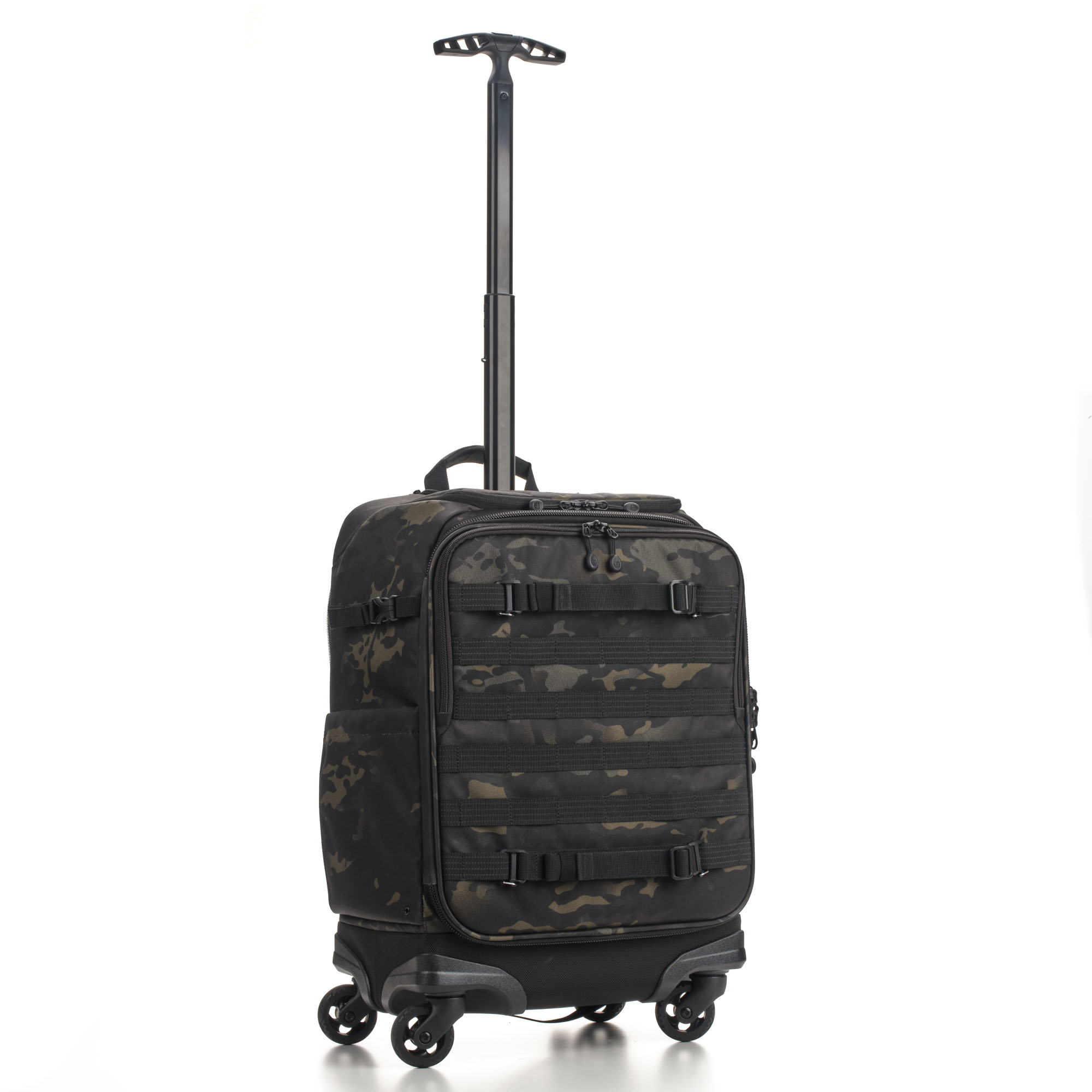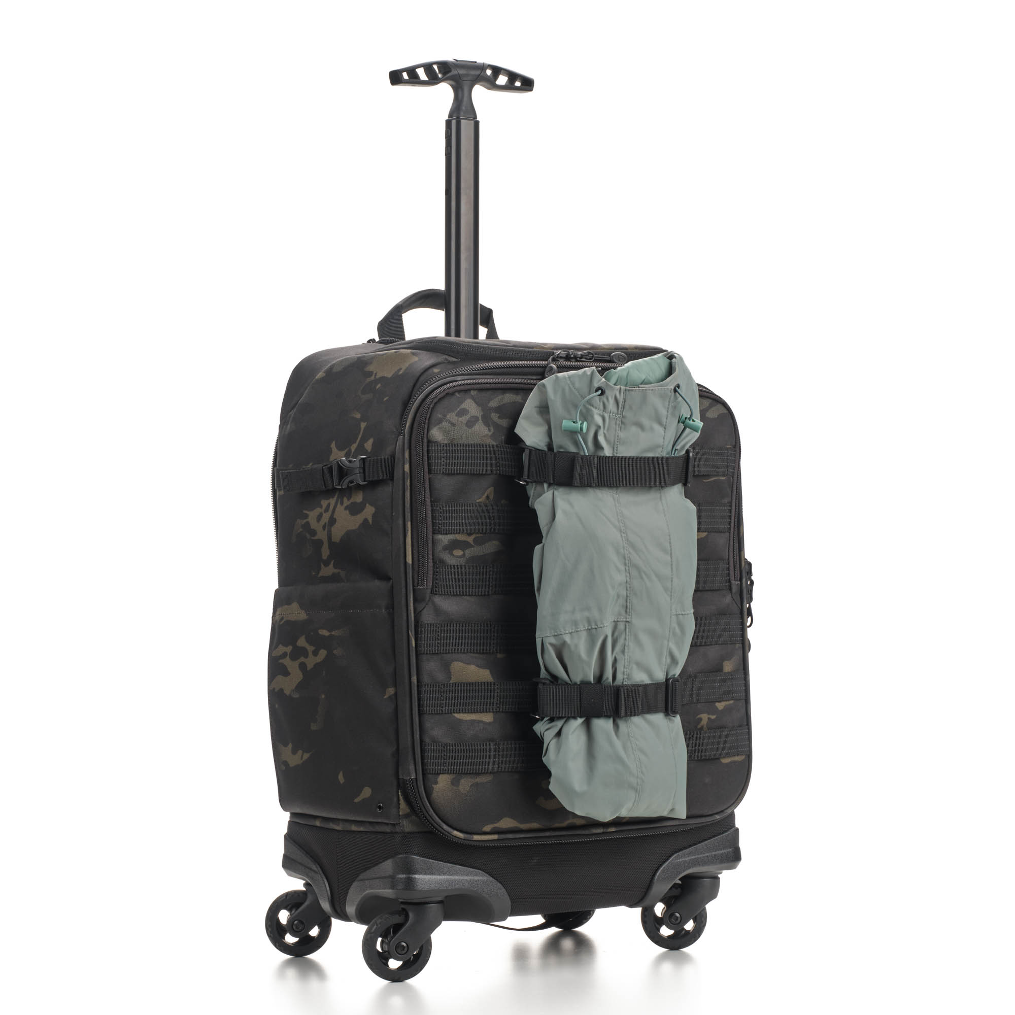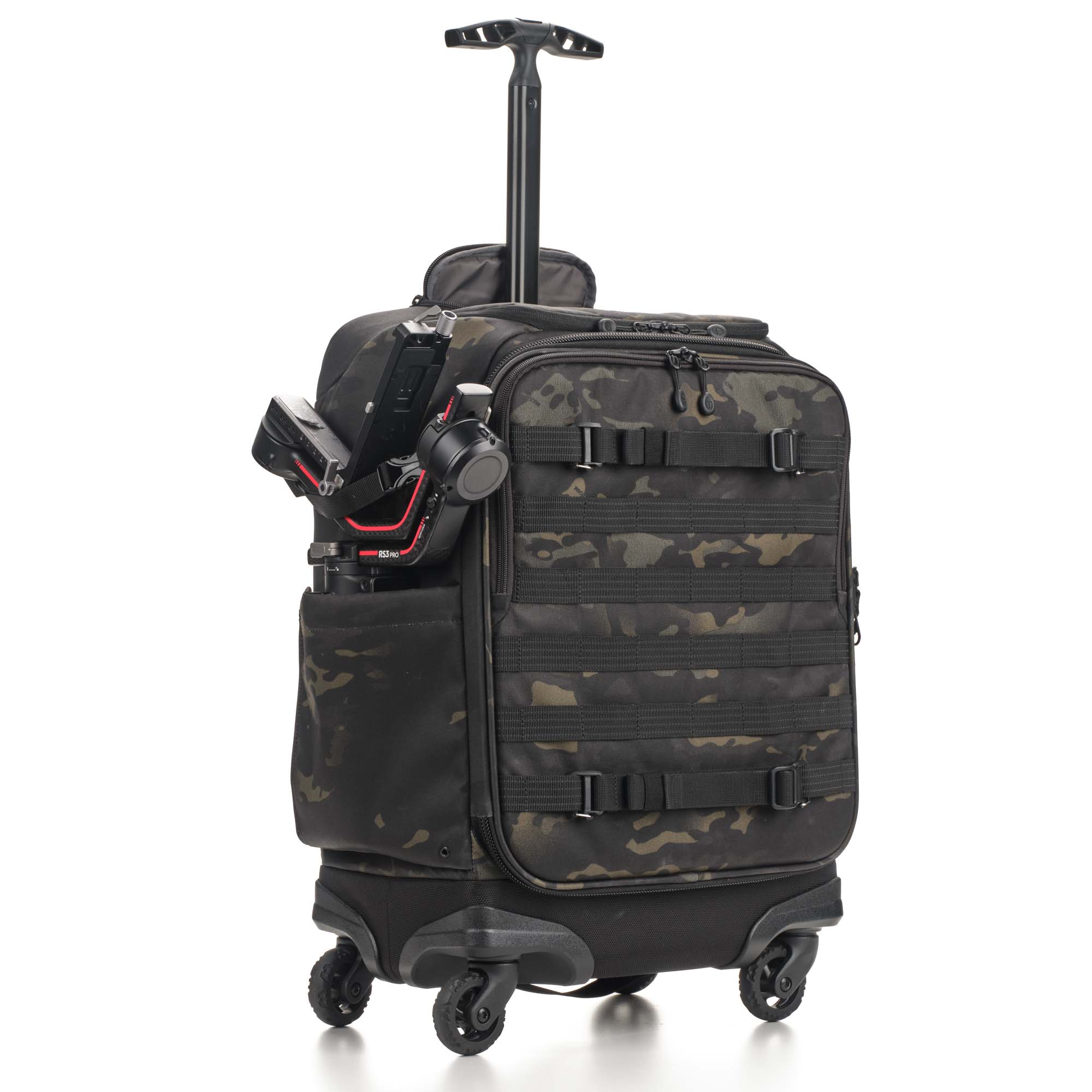 Не ограничивайте себя внутренним объемом чемодана. На передней и боковой панелях расположены стропы MOLLE, на которых можно разместить внешний обвес – чехлы для аккумуляторов и карт памяти, мультитул, карабин.