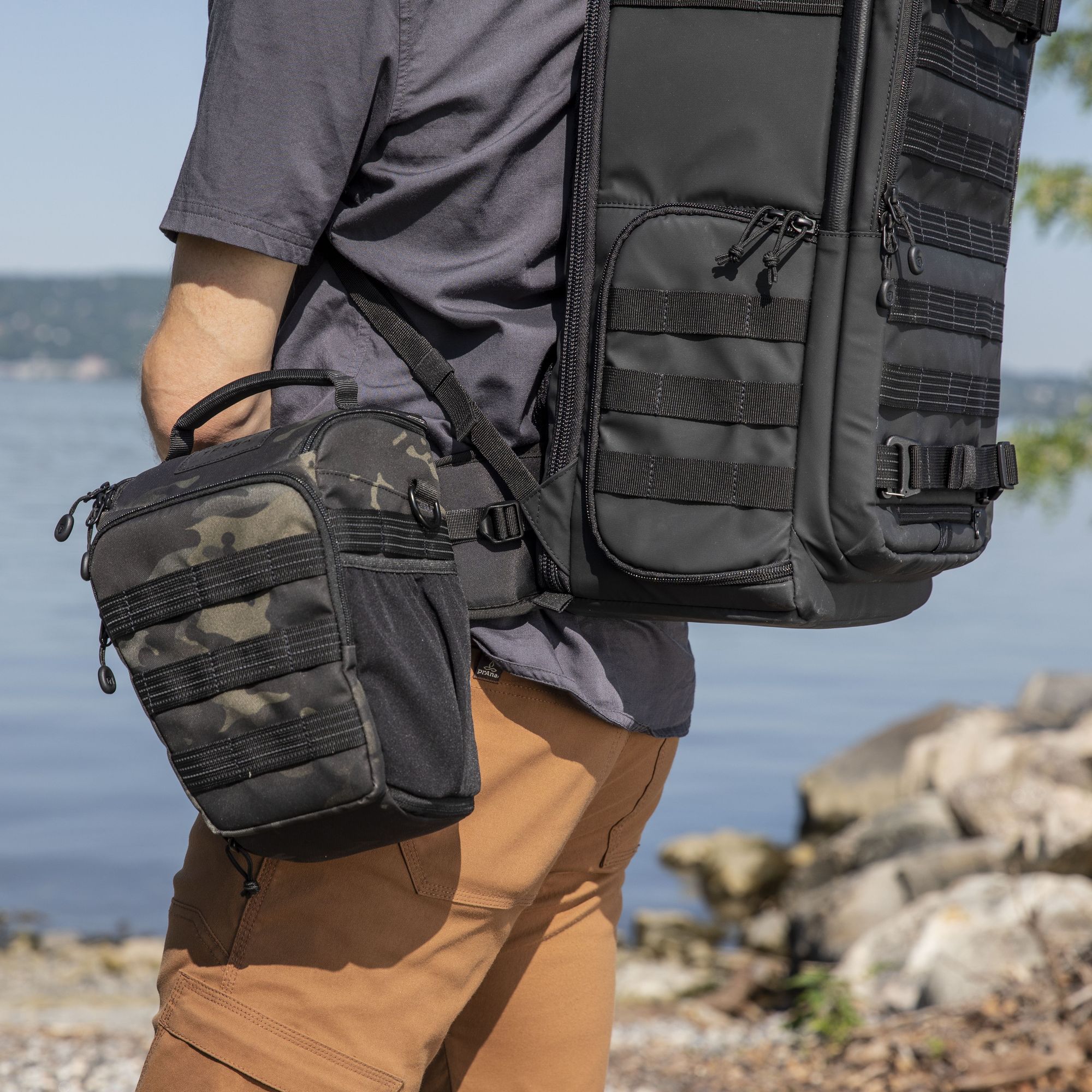 Не ограничивайте себя только внутренним объемом холстера. На передней и боковой панелях расположены стропы MOLLE, на которых вы можете разместить внешний обвес - чехлы для аккумуляторов, карт памяти и пр. Дополнительный объектив вы можете расположить в жестком чехле-капсуле Tenba Lens Capsule и закрепить его на стропах MOLLE. Также, вы можете использовать в качестве обвеса любой из подсумков и аксессуаров, совместимых с MOLLE.